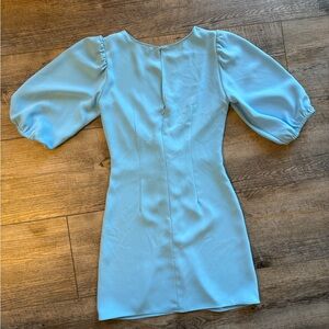 Chic mini dress with a twist front detail. Features three-quarter sleeves. Perfect for a stylish outing.