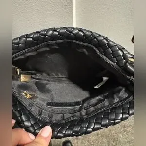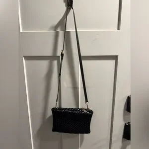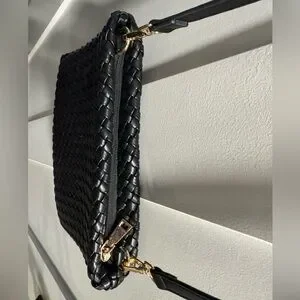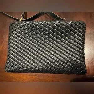 Chic black woven clutch with detachable strap. Perfect for versatile styling.