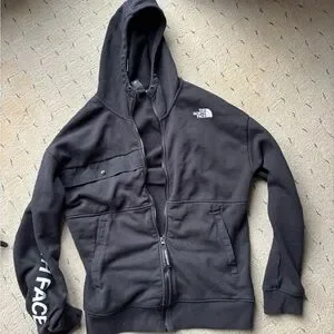Classic black hoodie with full-zip design. Features The North Face logo. Ideal for layering and casual wear.