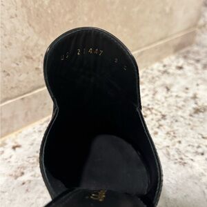 Elegant black leather mules with embossed logo. Features a pointed toe and comfortable block heel.