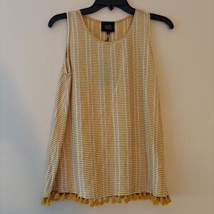 Fun and breezy, this Anthropologie W5 sleeveless top is perfect for summer layering or warm-weather style. It features a cheerful mustard yellow and white vertical stripe pattern with a playful tassel fringe hem. The soft stretch knit fabric drapes beautifully, making it easy to dress up with jeans and wedges or wear casually with shorts.