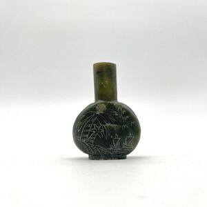 Keywords: miniature snuff bottle, green stone, etched, vintage decor, small vase, palm tree art, sailboat art, collectible vase, stone carving, vintage miniature, home decor, table decor, jade, jade snuff bottle