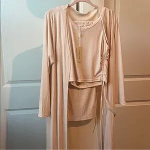 NWT pinky cream longe set. Comes with the pants that have pockets tank has pull tie strings and long robe cover up