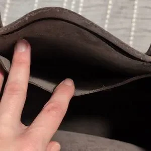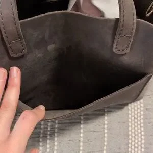 This tote is so soft! 😍 It's a beautiful nubuck/brushed leather. No zipper or snap, but has an interior pocket. I used this bag once.