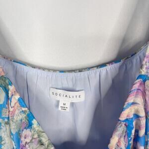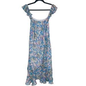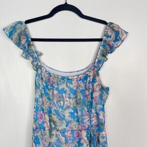 Socialite M Blue Purple Floral Ruffled Midi Dress Sleeveless Split Front Scoop