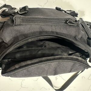 Great quality tactical/streetwear sling bag. Two small pockets on side; one small pocket at front; one large main pocket in top. Has adjustable strap and clip hooks. Great rugged quality, fits lots of things inside, perfect for daily carry.