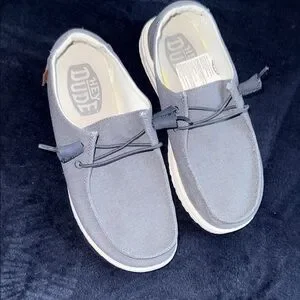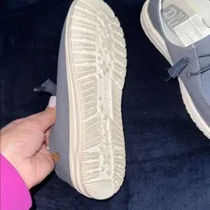 Experience ultimate comfort with Hey Dude slip-on loafers. Stylish blue design with easy slip-on feature. Like new no tears or stains just a little rubbed inside just from sock wear denim like blue look size 8