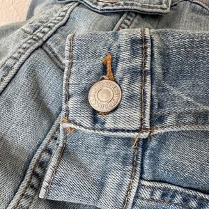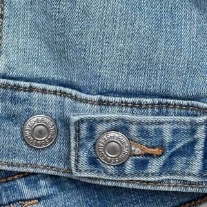 Features: Original Trucker Jacket with deep inside pockets., The original denim jacket since 1967, With an easy shape and versatile weight, stretchy, slightly cropped length, fold over collar, long sleeves, button-flap chest pockets.welt hand pockets, single-button cuffs, and straight-cut front and back yokes.
