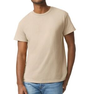 Comfortable sand-colored tee. Features stylish text design. Perfect for casual wear.