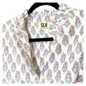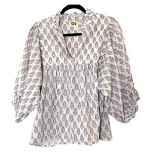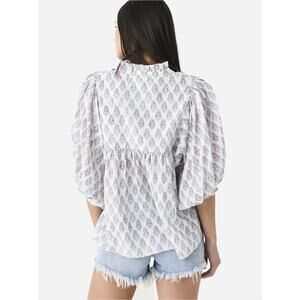 Block print blouse with a v-neckline, half-length sleeves, and a boxy silhouette.