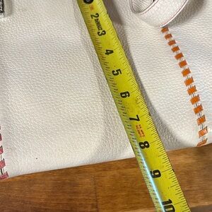Brighton shoulder bag with colorful stitching. Features red and blue accents. Ideal for versatile styling.