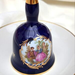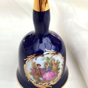 Elegant Limoges bell with a rich blue finish. Features gold accents and a charming painted scene.