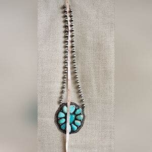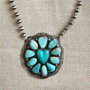 Gorgeous big and bright Turquoise heart pendant necklace by Navajo artist Kathleen Yazzie. This Gorgeous necklace is bright and beautiful and sits on a stunning string of Navajo rosary pearls. A beautiful piece for your collection ❤️