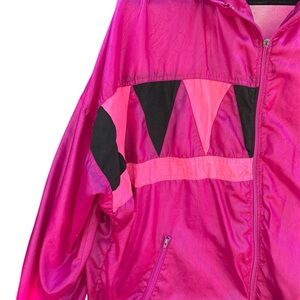 Make a bold statement with this vibrant pink bomber jacket, featuring striking black accents. Perfect for adding a pop of color to your wardrobe.