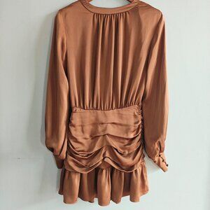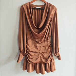 Ramy Brook Camilla Cowl Neck Mini Dress in brown or copper satin. It is made of 100% polyester with a satin finish and features a plunging cowl neck, blouson long sleeves with buttoned cuffs, ruched sides, and a ruffled hemline.