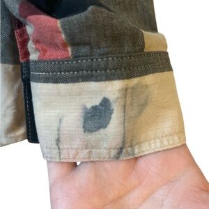 Burberry Children button up shirt. No holes and no loose buttons. There is a stain on the left hand cuff. Girls size 12. Flat lay measurements: 16.5 inches pit to pit, 20.5 inches sleeve length and 24 inches shoulder to hem.