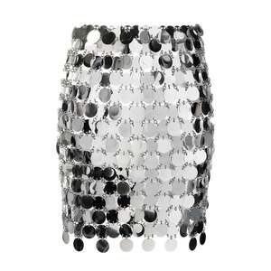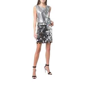 FR 40 - DESCRIPTION: Mirror-effect Mini skirt, featuring an intricate chainmail web of flat sequin discs for an unforgettable finish.Asymmetric construction Press-stud closure UnlinedSupplier color: Silver90% plastic, 10% brass.Made in Madagascar