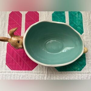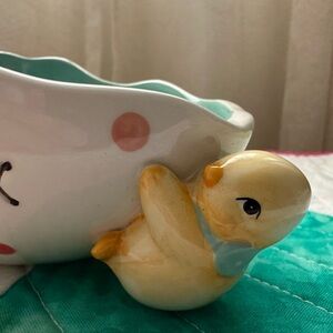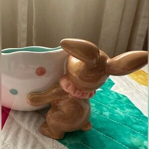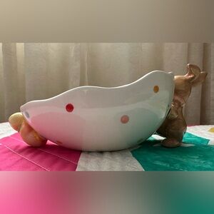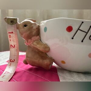 Charming egg bowl carried by an Easter bunny and chick.. Features 'Happy Easter” text.