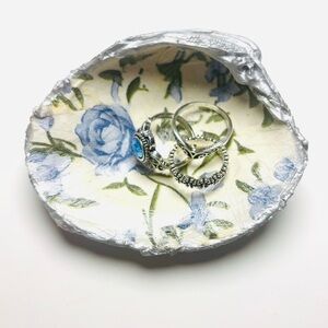 Handmade Clam Shell Trinket Dish w/ Blue Rose Decoupage Design. This shell trinket dish is 3” and comes with 3” alloy metal rings. It has a silver painted edge and back.