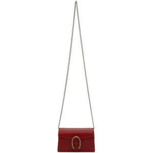This is an authentic GUCCI Calfskin Super Mini Dionysus Shoulder Bag in Hibiscus Red. This petite bag is crafted of grained calfskin in red. This shoulder bag features an aged silver chain shoulder strap and a gold textured horseshoe tiger spur closure encrusted with crystals. The double flap opens to a beige suede interior with a key ring.