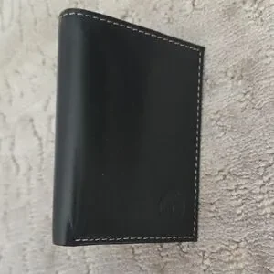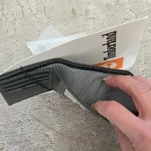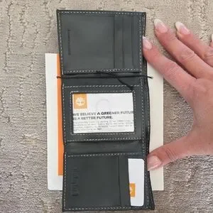 Elegant black leather wallet by Timberland. Features a tri-fold design.