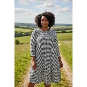 Chic houndstooth print elevates this Tommy Hilfiger dress into a sophisticated wardrobe staple. Designed with a flattering A-line silhouette and elegant gold button detailing on the bodice, this piece offers a timeless yet modern appeal. The 3/4 sleeves provide a touch of refined coverage, making it perfect for a brunch date or a smart casual office day.