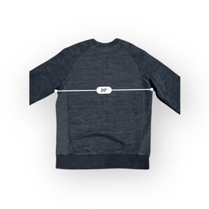 This is a pre-owned men's Champion crewneck sweater in a blue marl fabric. It features raglan sleeves and ribbed cuffs and hem. The neckline has a V-stitch detail and a visible brand tag that reads "Champion AUTHENTIC ATHLETIC APPAREL SIZE - MEDIUM SINCE 1919". The sweater measures approximately 26.5 inches in length from the back collar to the hem and 20 inches across the chest. The fabric shows some signs of wear consistent with a pre-owned item.