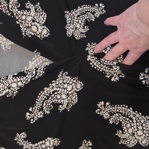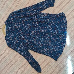 Elegant blouse with a floral design. Features a classic neckline and comfortable fit. There is a pleat that runs below the v-neck and sleeves can be left long or buttoned up to 3/4. Size L