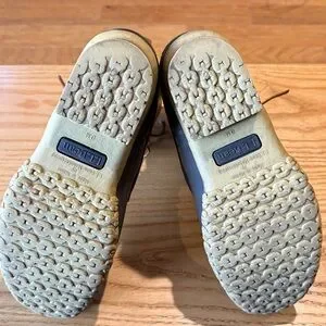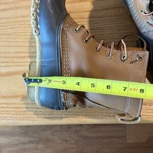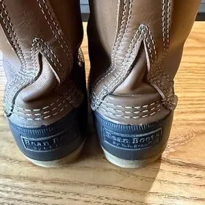 Classic L.L. Bean duck boots. Found in a thrift store while shopping for jeans for my 13 year old. (He just won’t stop growing.) Sizing info is worn off the tongue. Seems to be a Bean size 7, so a true size 8. There is significant heel wear, but the tread is otherwise solid. They seem to have their original laces. One lace is frayed at the end.