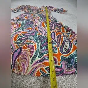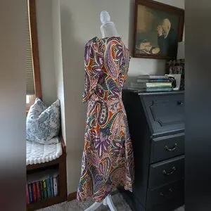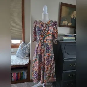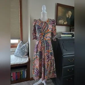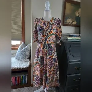 Tyler Boe Womens Dress Size Small Silk Purple And Orange Paisley Puff Sleeves and pockets.