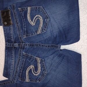 Silver Suki Mid Slim Bootcut Jeans Size 26. Dark wash stretch denim with factory fading and whiskering. Very good pre owned condition