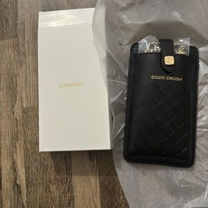 Sleek black quilted case. Features a luxurious gold chain. Iconic CHANEL style.
