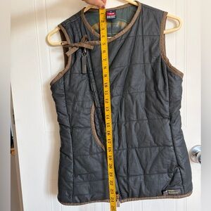 Dark charcoal/black Diesel quilted sleeveless vest with an asymmetrical zip and tie detail at the shoulder.