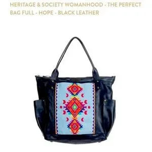 Black leather bag with vibrant geometric design. Features side pockets and sturdy handles.
