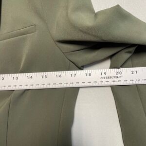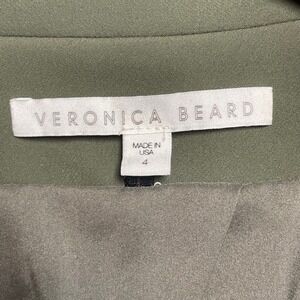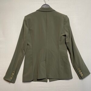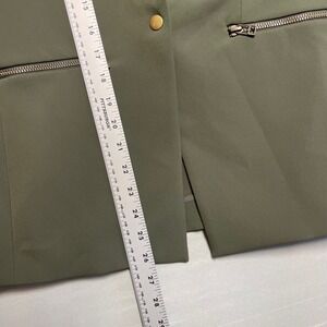 Veronica Beard olive green blazer jacket. One button closure with a single gold tone button. Features two zip pockets with gold tone zipper pulls on the front. Gold tone buttons on the cuffs. Lined interior.