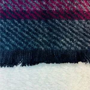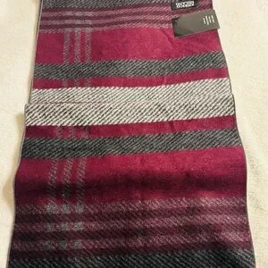 100% silk and features a reversible design with a plaid pattern. 60 inches in length and 12 inches in width with small fringe accents. Designed as a neck warmer in shades of burgundy, gray, and black.
