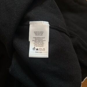 Soft and stretchy pull over three-quarter sleeve black sweater with white trim. Bow accent at neckline. Cotton, nylon. Hand wash. Sz XL. PTP 22”, length 24”. Very good condition.