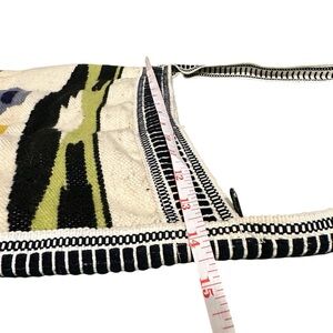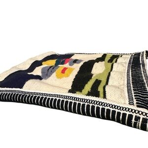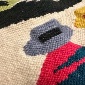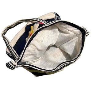 Wool woven bag featuring a vibrant multicolor design and zippered closure. Shows some signs of wear. A few loose threads, pilling (especially to the lining) , and a small hole in the lining. Please see photos. No stains.