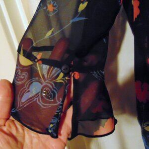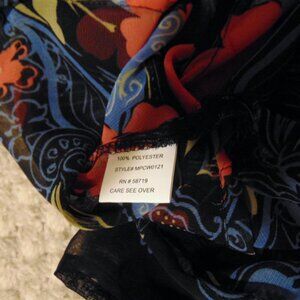 Soft and floaty, this sheer black floral blouse channels boho chic and cottagecore romance with its vibrant red and orange blooms drifting toward the hem. Designed in a relaxed fit with an approximate 44" bust (best for about a women’s XL), it features a classic collar, button front, flutter sleeves with button detail, and side slits that give it beautiful movement. Style it over a camisole with jeans and ankle boots for casual weekends, tuck it into a midi skirt for office-casual, or layer it under a blazer for a dark floral, date-night look. Fabric is lightweight, non-stretch polyester—gently preowned with no major flaws noted, ready to wear and enjoy.