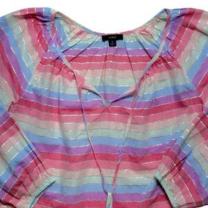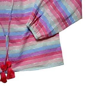 J Crew •Metallic Threading •Front Tie Detail •Relaxed Fit •Peasant Style •Tassel Accent •Elastic Cuffs •Long Sleeve •Pastel •Rainbow •Casual •Spring •Summer •Cotton