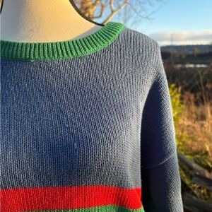 Vintage 1980’s 100% cotton knit sweater featuring bold colour blocking in blue, green, and red. Relaxed fit with a classic crew neckline and soft breathable cotton.