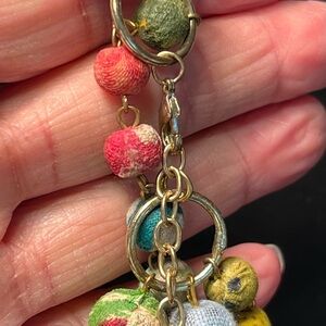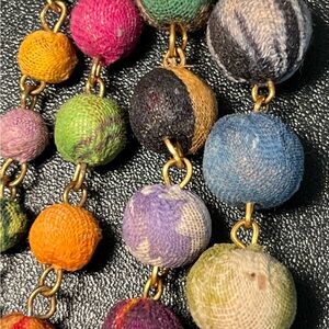 Kantha textiles (layers of old saris sewn with running stitches) made into beads, often combined with wood or brass, creating sustainable, fair-trade jewelry that supports women artisans and reduces textile waste. Each necklace features vibrant, one-of-a-kind patterns, making them distinct accessories that blend traditional craftsmanship with modern design.