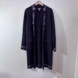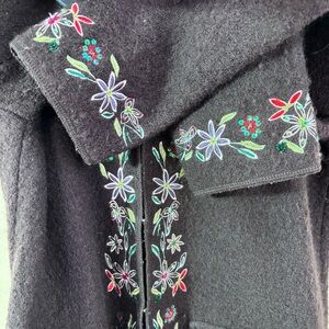 Long wool dark brown jacket by Kenar. Features colorful floral embroidery with tiny sequins. Perfect for stylish layering! Measures approximately 19 inches pit to pit when closed with the fastener hooks and 40 inches long. Hem is 22.5 inches wide. Pet friendly and smoke free home.
