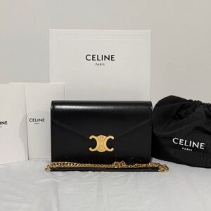 Sleek black clutch with iconic gold chain accent. Sophisticated design by Celine. Ideal for evening wear.