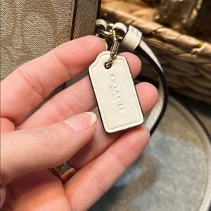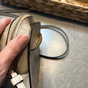 Elegant Coach cream crossbody in good used condition. The outside pocket is curving as shown in pictures. Does not affect the purse at all.