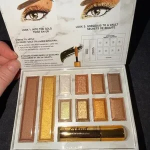 Create stunning eye looks with this gold and bronze palette. Includes shimmering shades and a volumizing mascara.