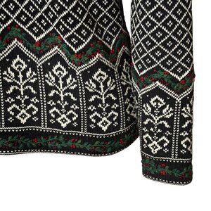 Gorgeous 90s Talbots sweater made in Hong Kong with intricate Fair Isle and holly vine embroidery. Detailed metal clasps and festive Nordic pattern. True vintage cotton knit with timeless holiday appeal.