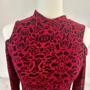 Turn heads in this striking Jessica Simpson bodycon dress, featuring a bold red and black pattern. This dress has a high neckline with a slight mock neck and cold shoulder long sleeves. The fabric is soft, form-fitting and stretchy, hugging the body with ruching on the sides creating a slimming effect. Lined.