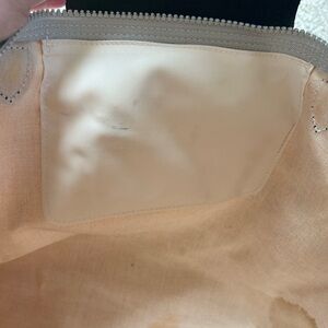 Stylish gray Longchamp tote bag featuring a vibrant butterfly design. Perfect for adding a touch of elegance to any outfit. Lots of staining and mark especially on the inside. Canvas with leather trim.