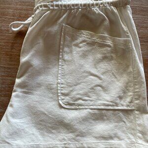 These shorts are super comfy and stylish. They look brand new and are white linen. Elastic waistband along with a drawstring, pockets in the front and back.